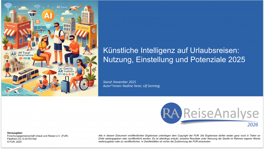 Das Special „Künstliche Intelligenz auf Urlaubsreisen – Nutzung, Einstellung und Potenziale im deutschen Urlaubsreisemarkt 2025“ gibt in Form eines Chartberichtes einen kompakten, datenbasierten Überblick zum aktuellen Stand der KI-Nutzung im Urlaubsreisekontext.